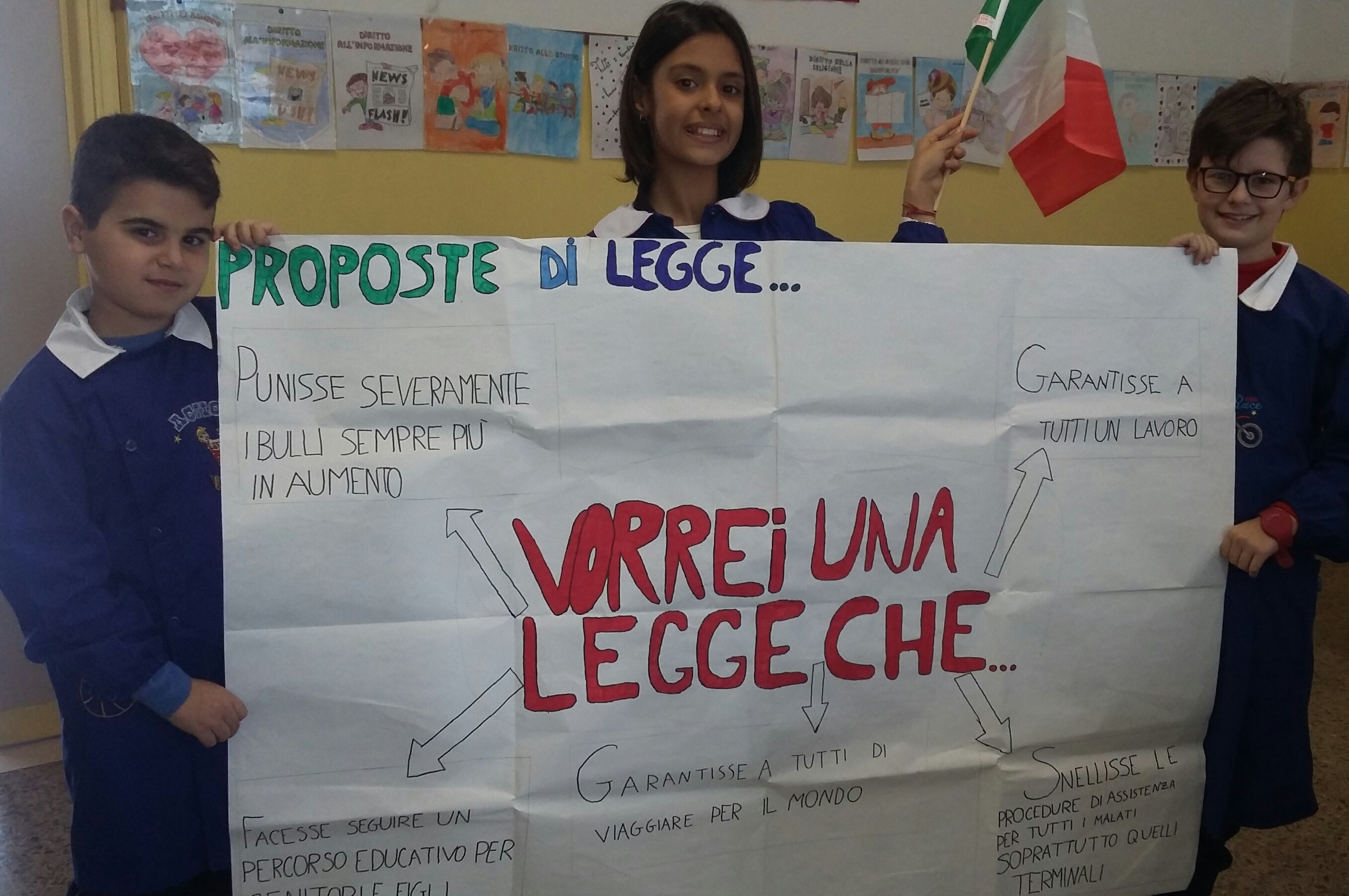 I bambini presentano un progetto di legge con il quale vogliono istituire un blog nazionale con lo scopo di consentire a bambini e ragazzi desiderosi di dialogare tra loro di condividere le conoscenze e le esperienze di Cittadinanza vissute nella scuola e nell’ambiente di vita in modo da confrontarle con quelle di altri piccoli cittadini attraverso un’interazione reciproca. Negli articoli della legge specificano finalità e caratteristiche del loro blog tra cui dare spazio al confronto delle idee, alla condivisione delle esperienze, al riconoscimento dei Diritti dei bambini, a comportamenti esemplari di Legalità, nell’esercizio della Libertà e della Democrazia. Con apposito provvedimento vengono nominati: un Amministratore garante dei Diritti dell’Infanzia con compiti di supervisione e controllo che si avvarrà, per la gestione, l’organizzazione e la sicurezza in rete della collaborazione di un team di esperti della comunicazione digitale e di un moderatore, appositamente designato, che assicurerà il corretto inserimento dei post e dei commenti prima della pubblicazione affinché vengano rispettate le finalità della presente legge.