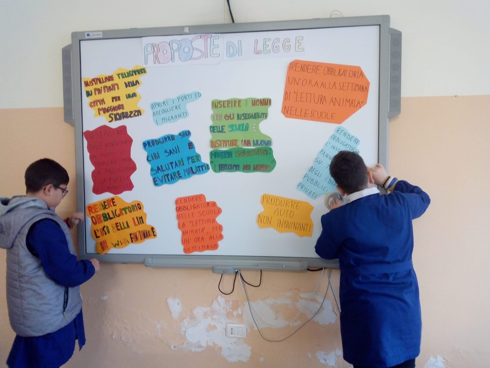 Il tema prende spunto dalla partecipazione dei bambini ad una commemorazione dei caduti in guerra a cui ha fatto seguito una riflessione in classe sui conflitti mondiali e sulle condizioni in cui vivevano le persone al tempo della guerra. Per saperne di più hanno intervistato alcuni nonni, sia invitandoli a scuola, che recandosi presso il centro anziani del paese. Attraverso questo percorso gli alunni hanno capito le motivazioni che hanno portato alla stesura della Costituzione, da chi è stata scritta e quando; ne hanno compreso la struttura e il contenuto e perché rimanesse impresso nella loro mente hanno inciso i principi fondamentali su tavolette di pasta di sale. Proseguendo il percorso didattico sono stati positivamente impressionati ed affascinati dai racconti dei nonni e degli anziani del paese; hanno capito l’importanza delle storie narrate e sono giunti alla consapevolezza che conoscere il passato serve a comprendere meglio il presente, a capire le scelte fatte dagli uomini nel corso della storia e a migliorare il futuro. Hanno pertanto pensato ad un disegno di legge che prendesse in considerazione appunto i nonni e il desiderio dei bambini, affascinati dai loro racconti, di averli a scuola vicino a loro per trarne insegnamento. Nasce così la proposta di legge Nonni in cattedra che prevede l’inserimento dei nonni nel corpo docente di ogni scuola e l’istituzione, per un’ora alla settimana, di una nuova materia di studio: “I racconti dei nonni”.