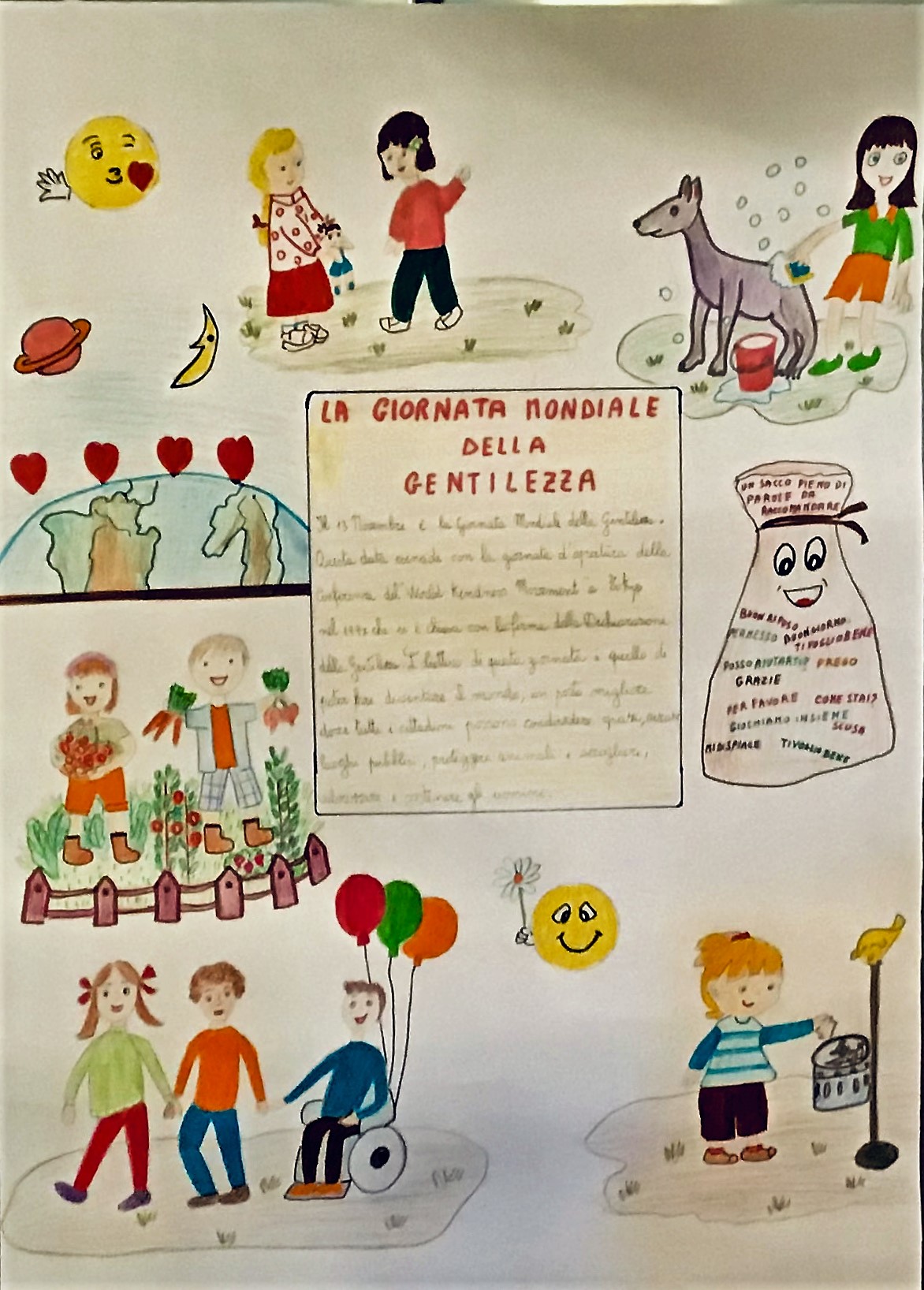 I bambini si concentrano sul tema della gentilezza in tutte le sue forme, non solo come buone maniere ma anche come attenzione verso gli altri, come educazione all’ascolto e alla pazienza, abbandono dell’aggressività, accettazione delle diversità; ma anche rispetto dell'ambiente, della natura, degli animali, del proprio paese, della propria famiglia. Chiedono che venga introdotta a scuola un'ora di "Educazione alla gentilezza" e la rappresentano in varie forme: realizzano una poesia e un disegno per ogni articolo del disegno di legge, dei cartelloni che rappresentano la giornata della gentilezza, e creano ad hoc un logo e uno slogan "Bambini si nasce, gentili si diventa".